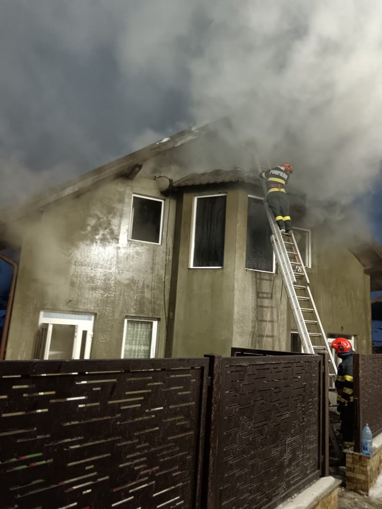 Flăcările au distrus acoperișul, podul și mansarda locuinței, cu bunuri din interior, pe o suprafață de aproximativ 170 metri pătrați.